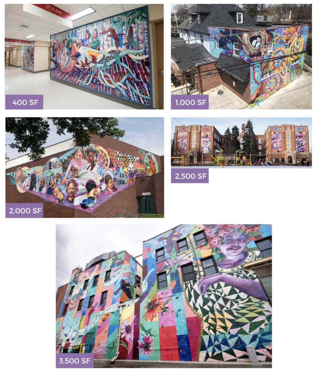 These murals by GoodSpace Murals may help you visualize the square-footage of murals on real buildings.