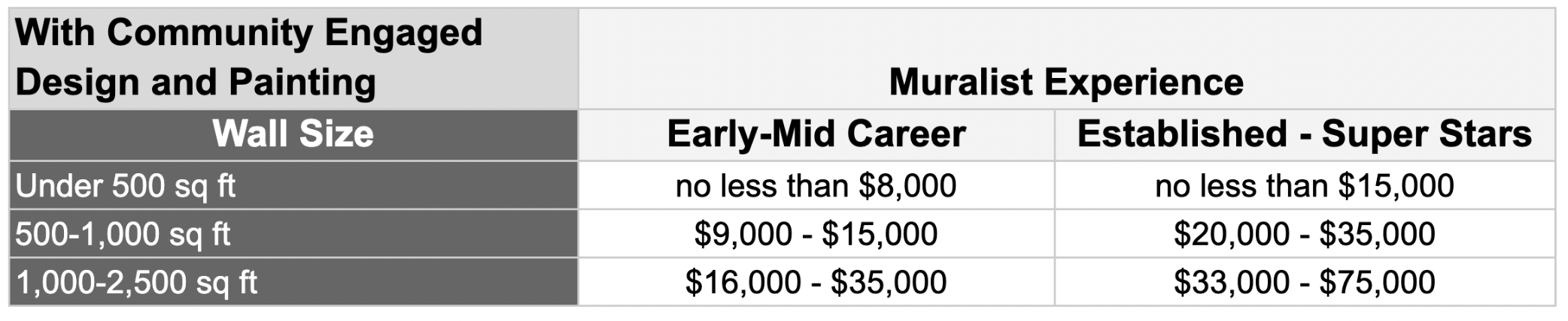 The cost of a mural is mostly driven by three factors: size, the experience of the muralist, and whether the community participates in the design and painting of the mural.