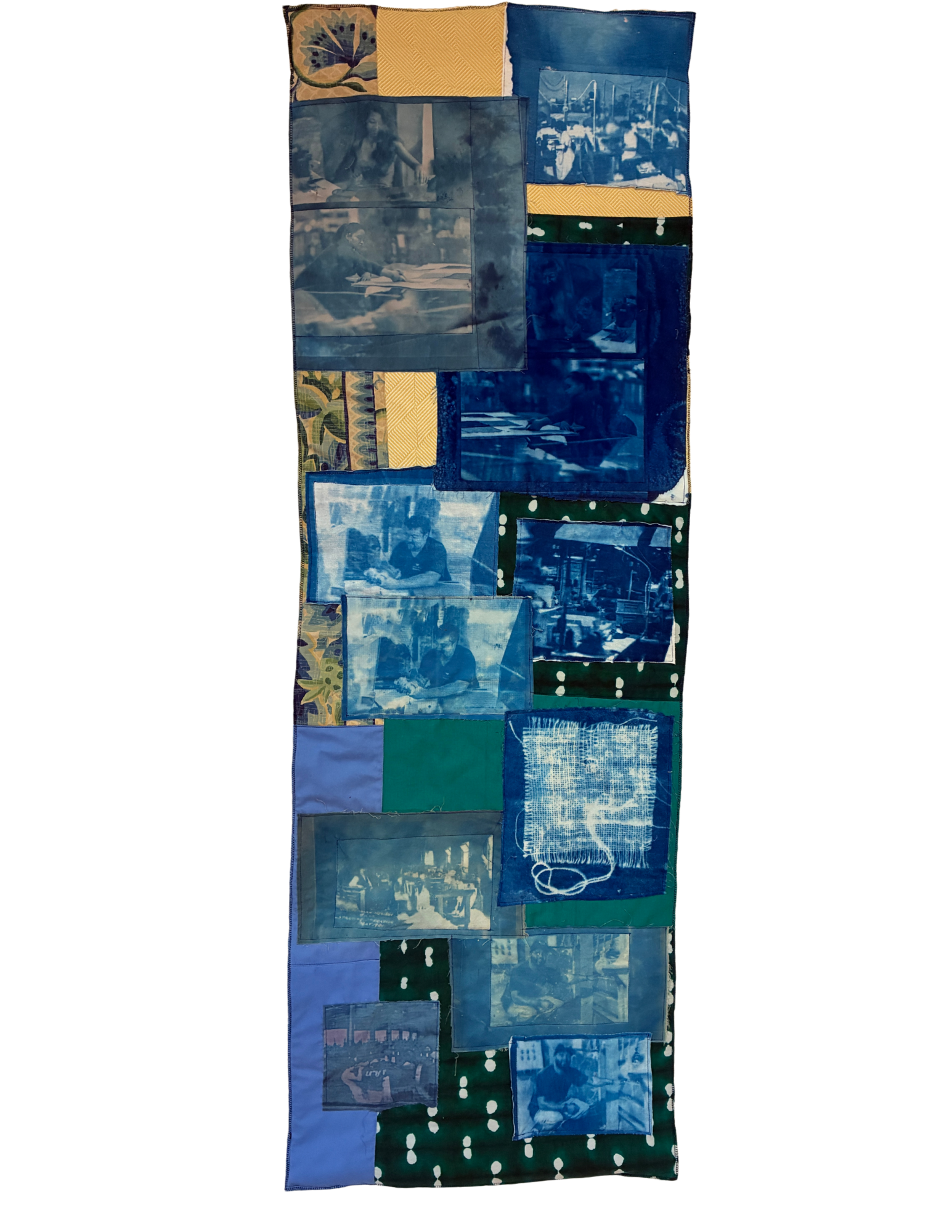 This cyanotype photograph fabric collage is a celebration of workers, past and present, in textile manufacturing and production. Pictures of workers in Morganton’s factories of the 1930s, 40s, and 50s, as well as before, such as an image of the Waldensian Hosiery plant in 1901, are courtesy of the North Carolina Room at the Morganton Public Library. Modern images include pictures of staff at Material Return, as well as other enterprises under the umbrella of the Carolina Textile District and Textile Engine ecosystem. Playful image layering and collage technique bring these images to life, showing us the past is still alive as we innovate, research, root in place, and move forward creating dignified and equitable conditions for workers in manufacturing.