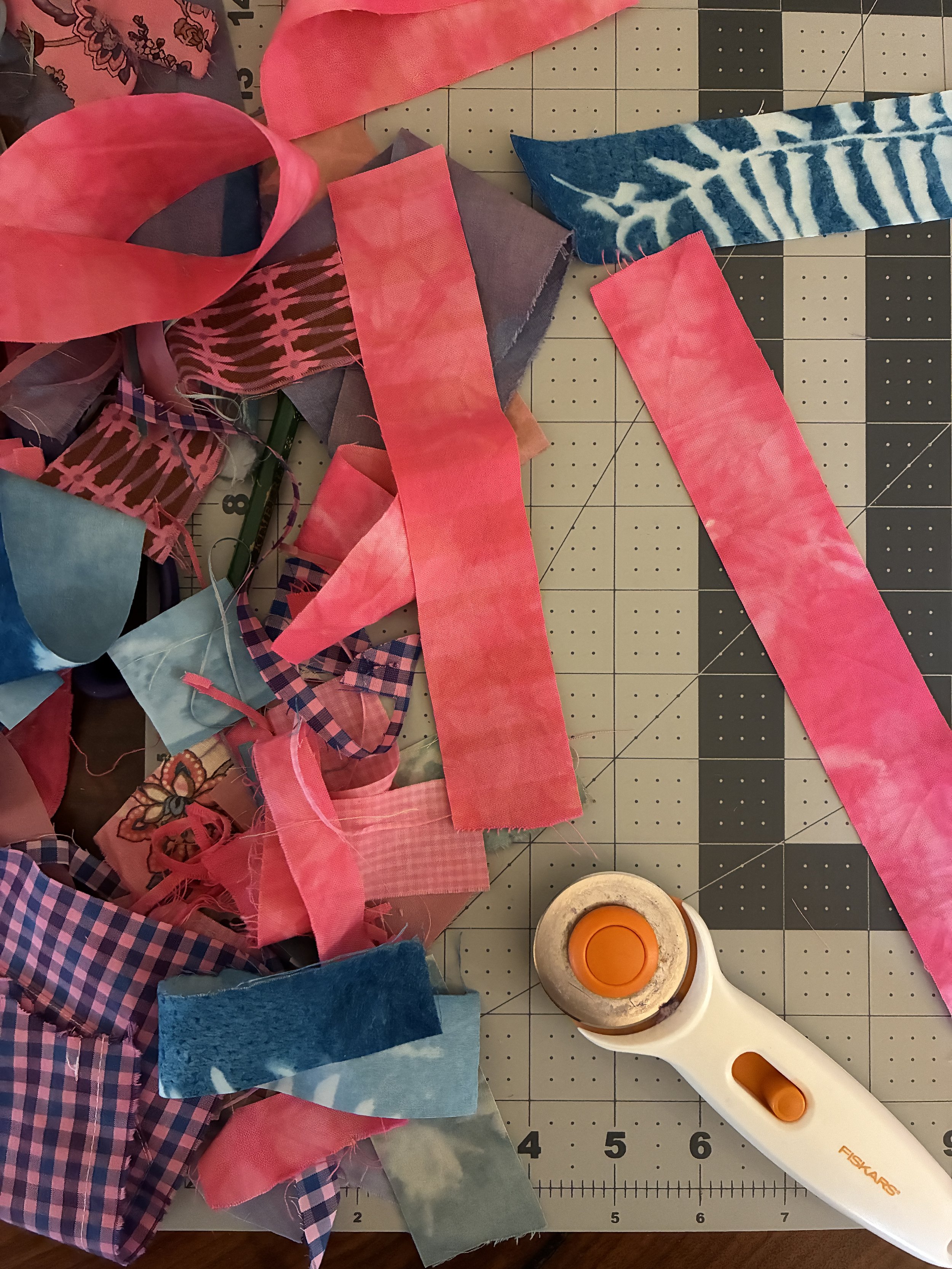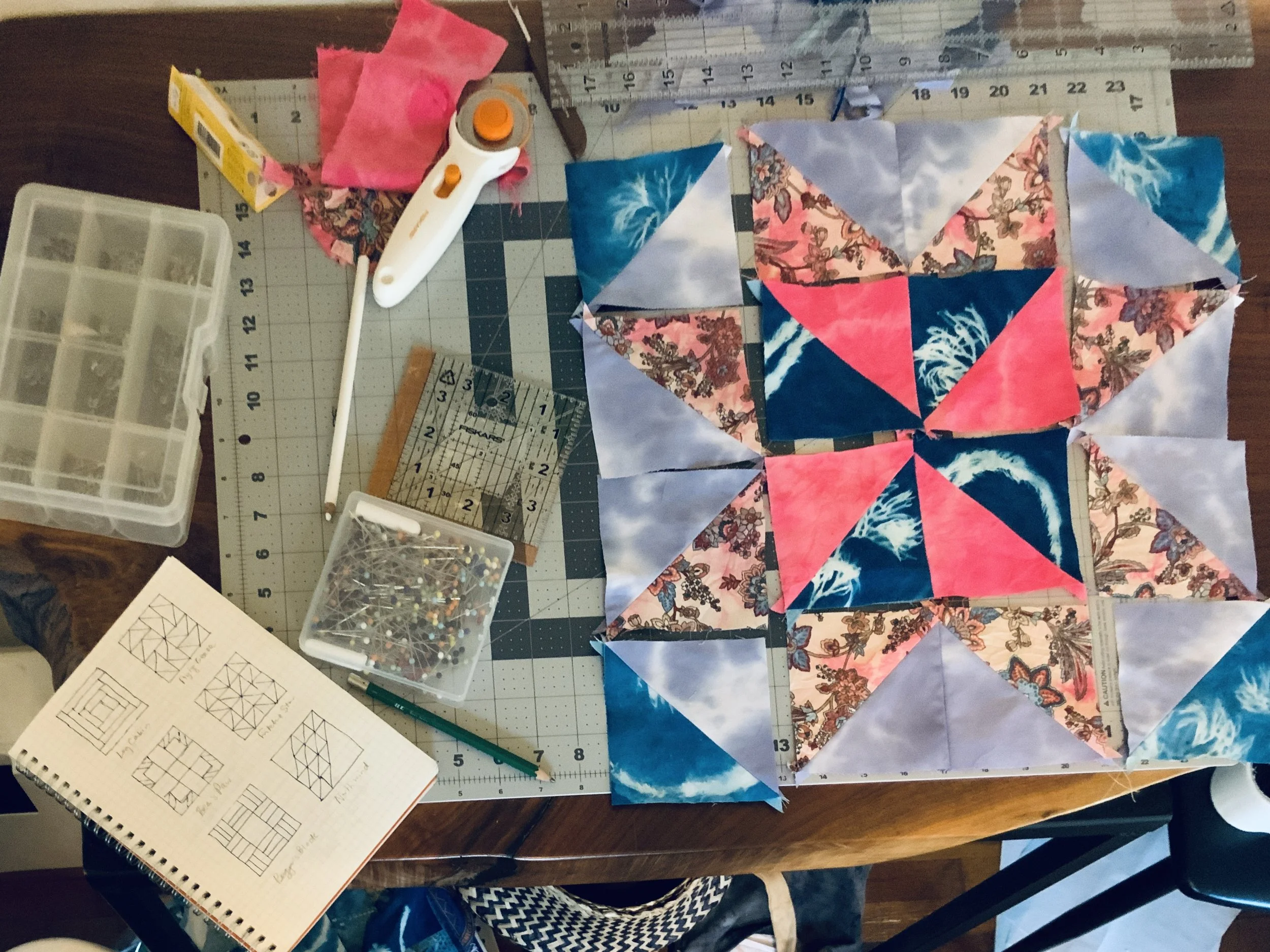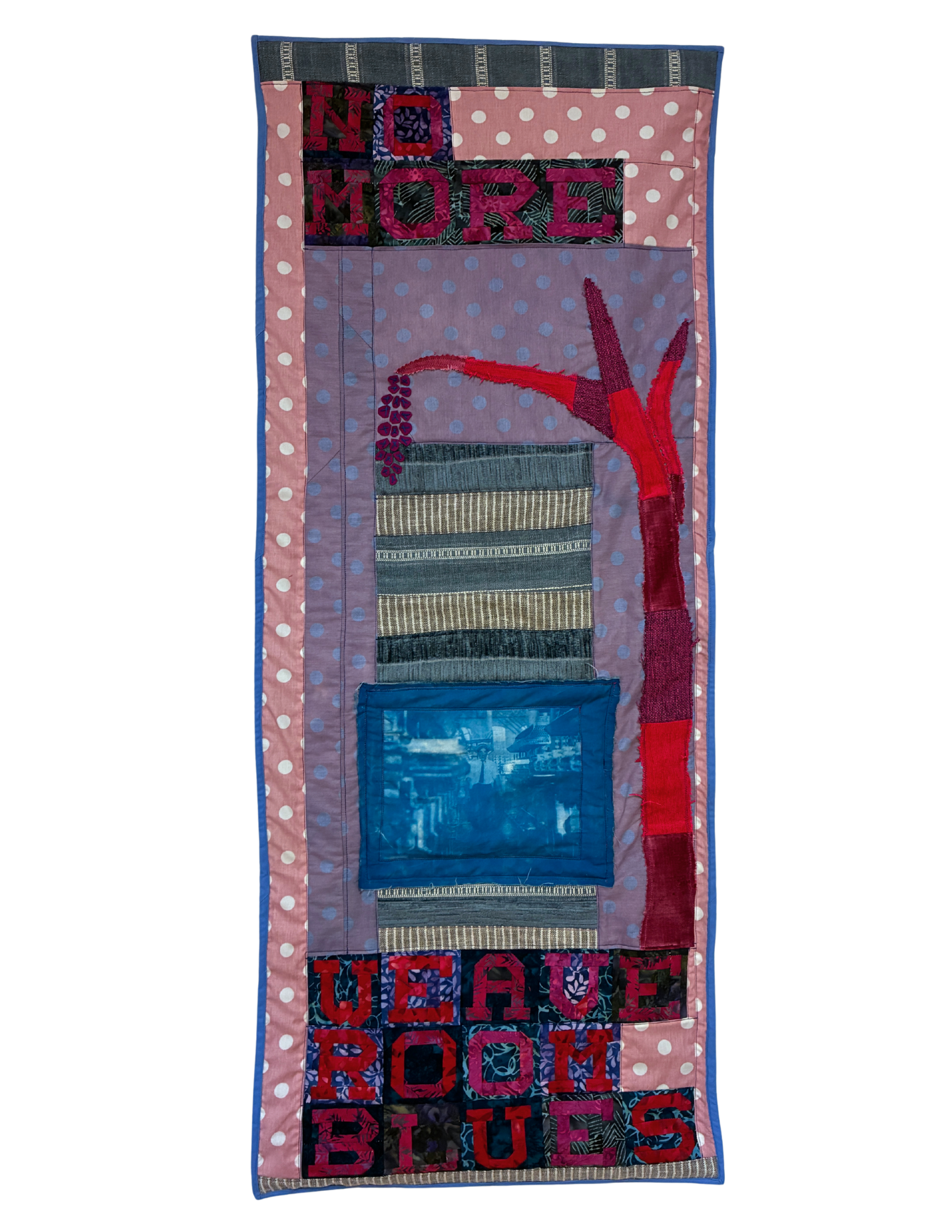 The five works of art I created for the TOSS Air at TIC are a quilt made from shirt sleeves and neck ties, a sampler quilt of traditional American folk art patterns, and a series of three quilted fabric collages utilizing cyanotype printmaking as well as various quilting and embroidery techniques. These pieces serve as examples of reuse and transformation, while celebrating the heritage of Morganton and Burke County, and juxtaposing the manufacturing of yesterday with the work being done by Material Return and The Industrial Commons to propel sustainable and equitable manufacturing systems forward.