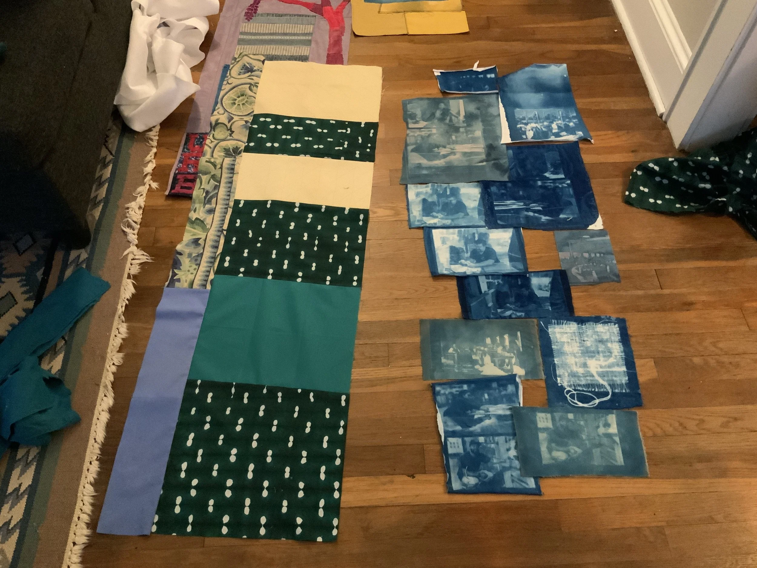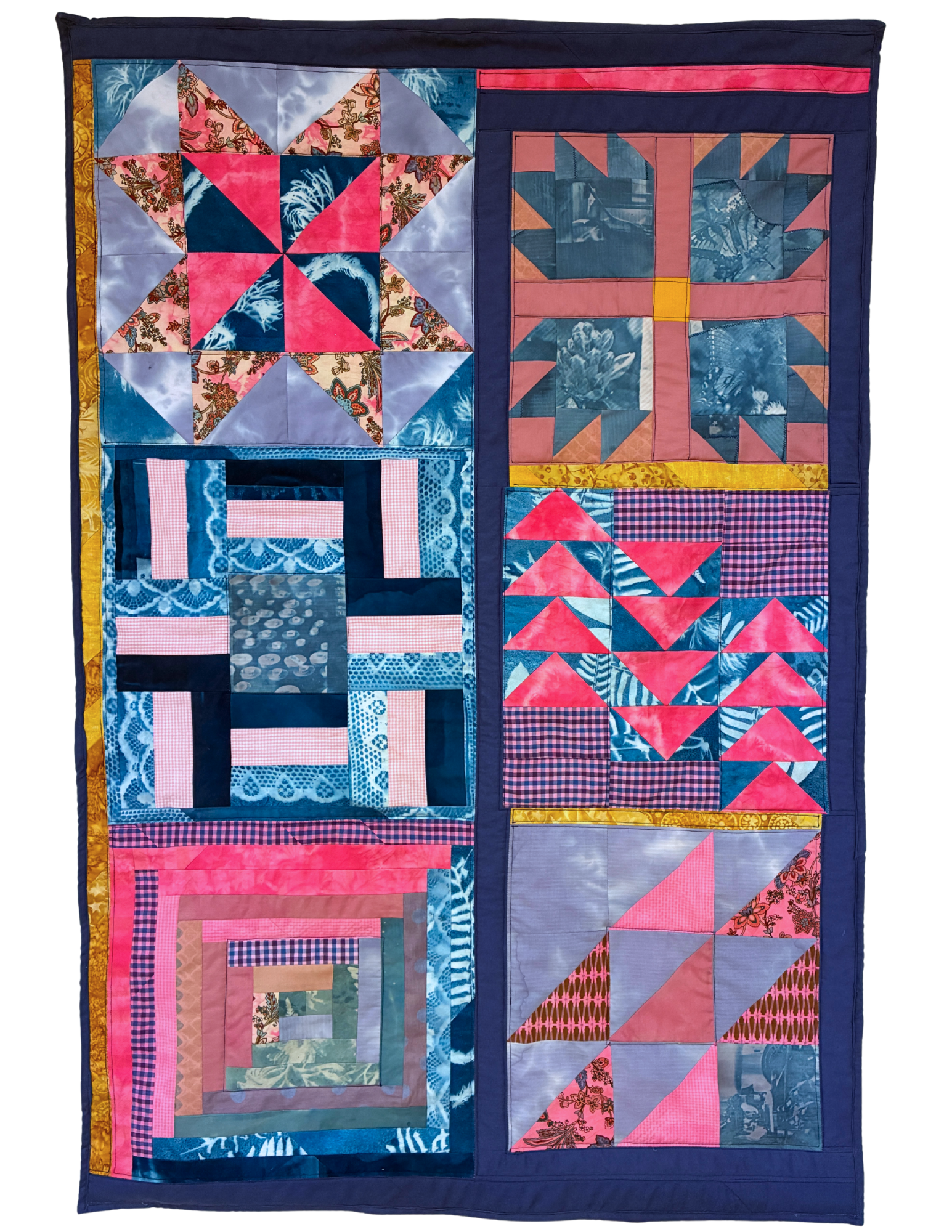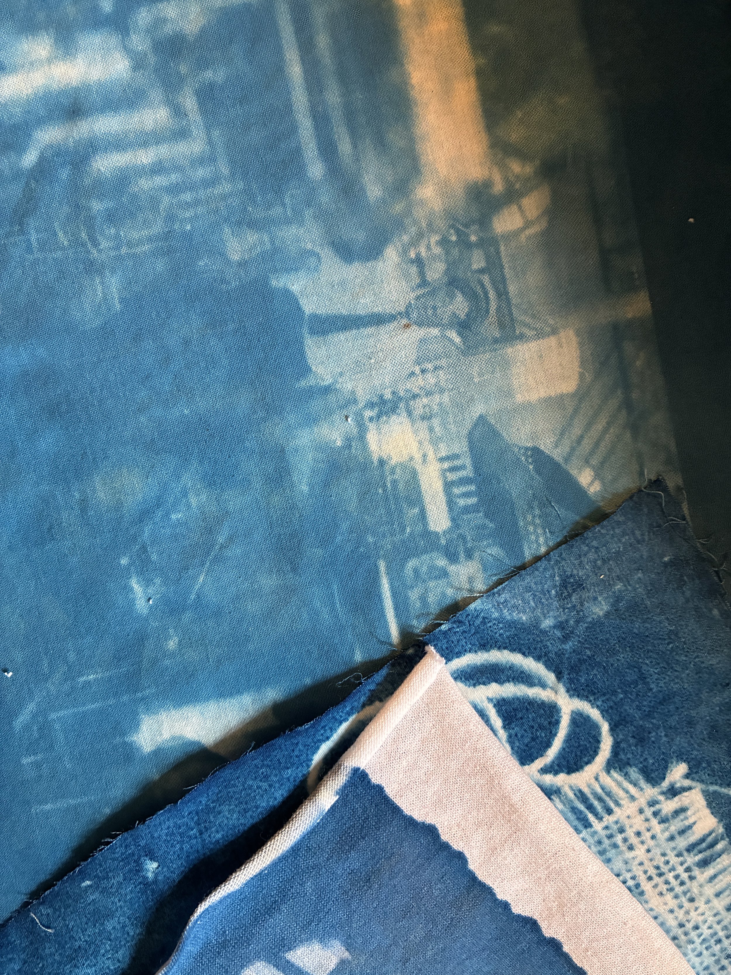 This sampler quilt transforms materials from the Material Warehouse completely, through dye, print, and simple cut and sew. Cyanotype motifs of the Eastern Tiger Swallowtail Butterfly, images of machinery and factory settings, and local ferns and club moss indicative of the Appalachian mountains are printed onto scraps of button up shirts, pillow cases, and discarded scraps of other quilters, which are incorporated into traditional American quilt blocks. Through this sampler quilt, I honor the tradition of quilting as an American folk art, while showcasing the transformative powers of material upcycling and recycling.