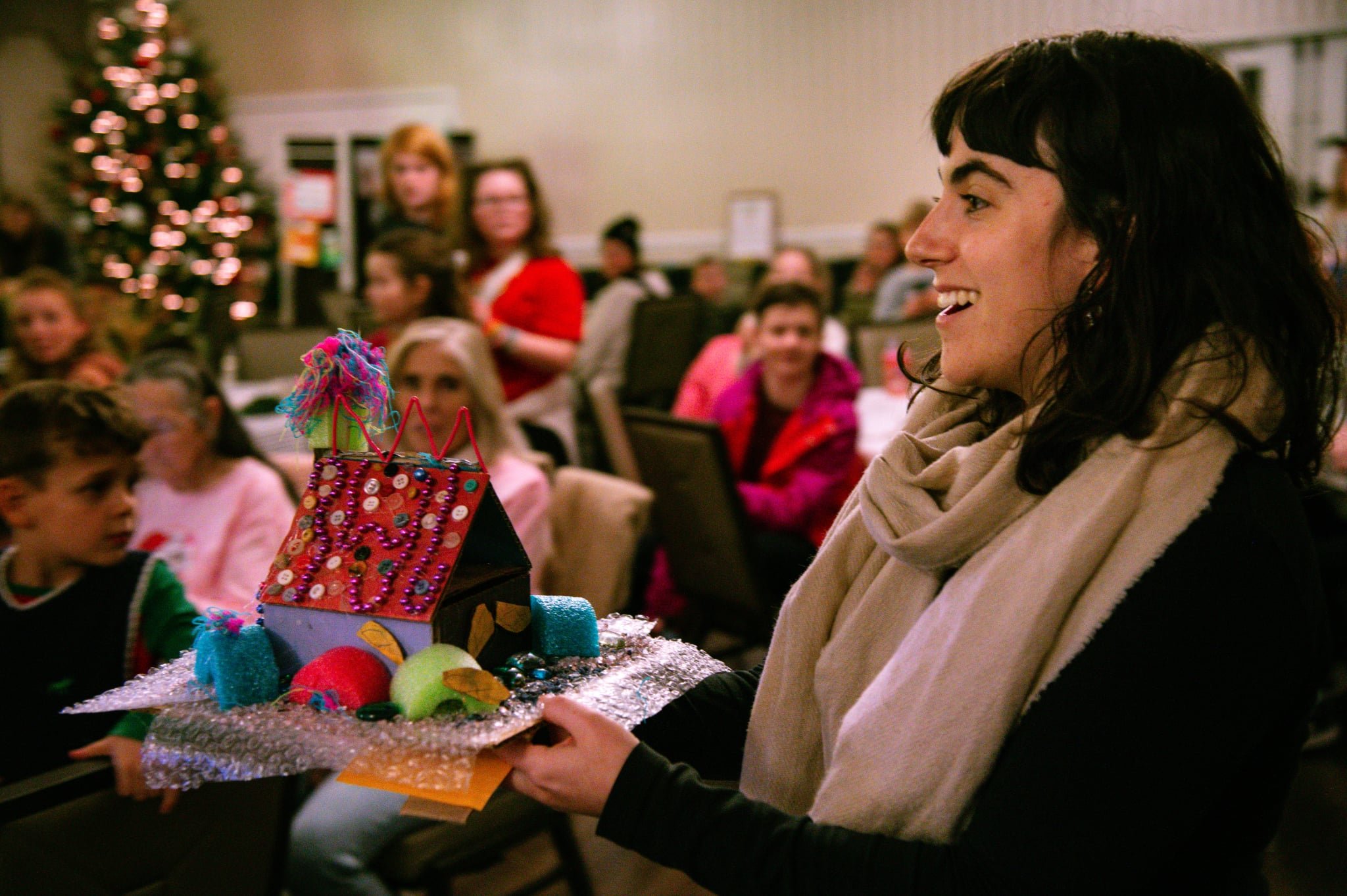 Sophie displaying a student art piece at the Winter TOSSing event. She participated as a judge for our annual upcycled student art competition.