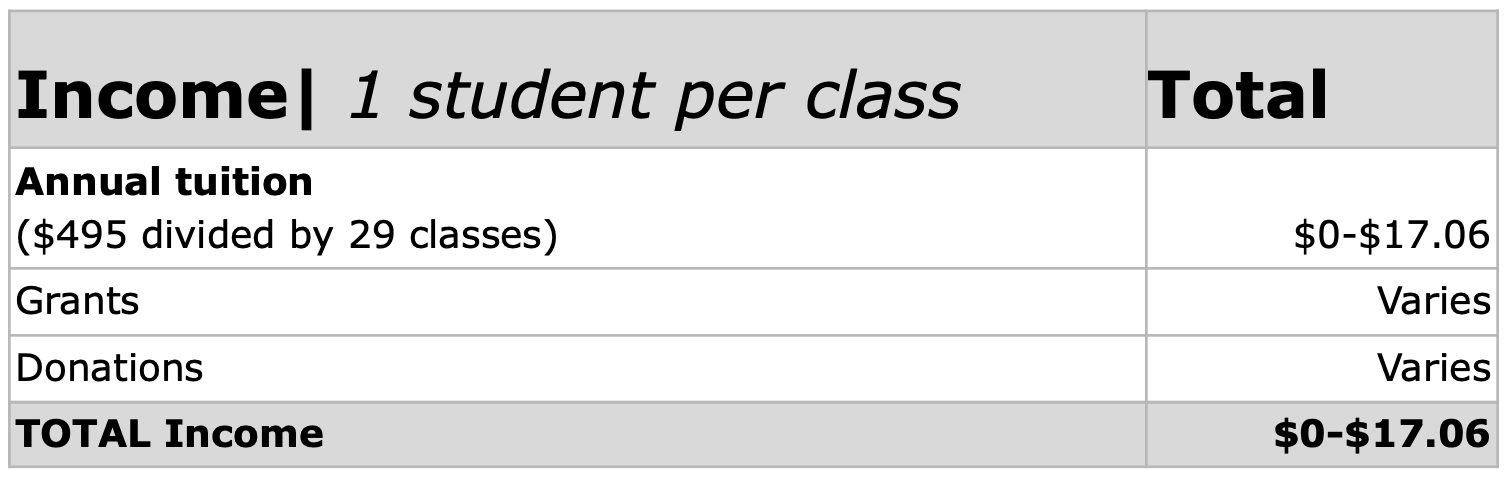 Our tuition is averaged across the full school year, so monthly payments stay the same regardless of the number of classes in a given month. The true cost per student is $67/month, but thanks to grants and donations, families pay only $55/month and 40% of our participants participate on full, need-based scholarships. This structure keeps tuition affordable while ensuring program sustainability. Find more financial transparency details, see below!